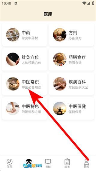 2、在医库页面,点击选择中医常识分类,进入中医常识页面。