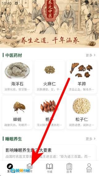 1、在养元中医发现页面,点击底部医库,进入医库页面。
