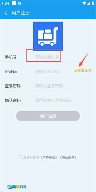 2、在注册账号页面填写手机号码后,点击获取验证码。
