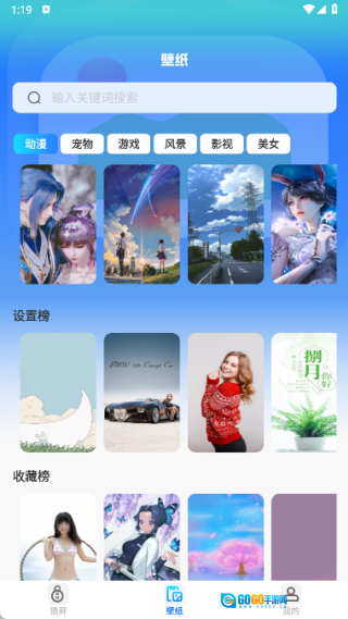 3、在壁纸页面,你可以浏览动漫、宠物、游戏、风景、影视及美女类别的壁纸,同时还能查看设置榜、收藏榜以及其他榜单的内容。
