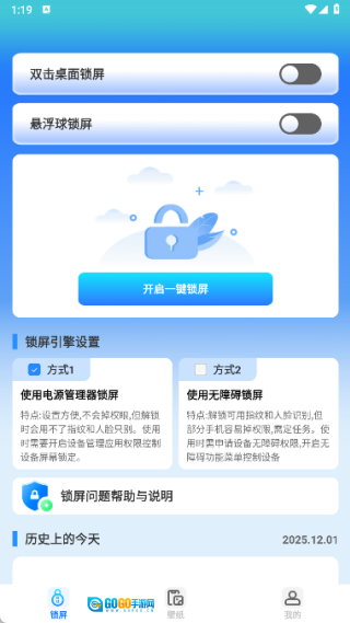 1、在锁屏界面中,用户可以通过双击桌面实现锁屏,也能对悬浮球锁屏功能进行设置,从而随时启用一键锁屏功能;