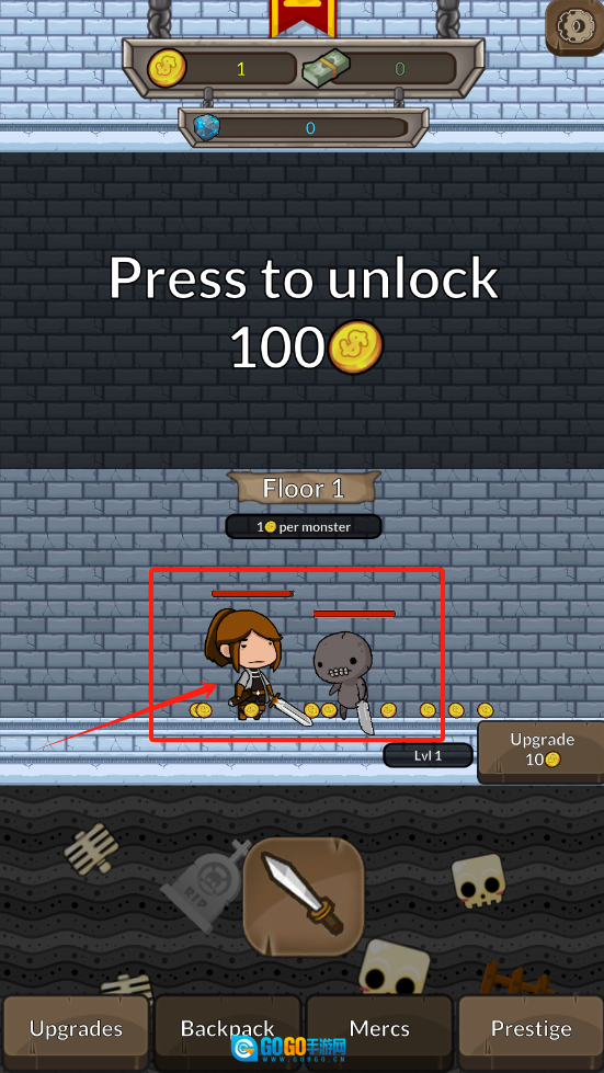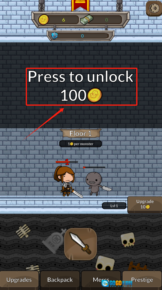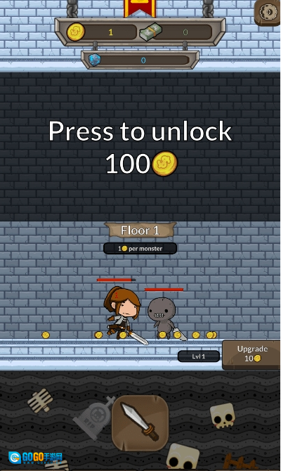 2、击败小怪获取金币,累积到100点后Press to unlock,下方升级装备需要消耗10金币。