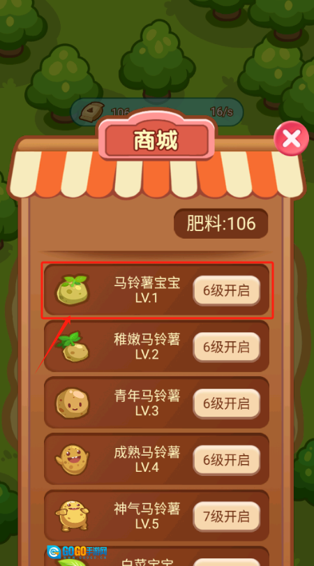 3、在商城里挑选马铃薯宝宝,把它升级到6级后,就可以购买更高级别的马铃薯种子了。
