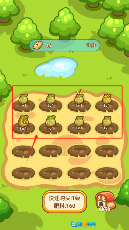 2、挑选带有+2标识的幼苗优先施肥,待左上角的金币数值增长至160时,再去购买新的肥料。