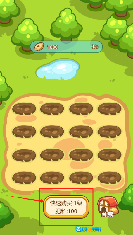1、点击左下角红框内的肥料按钮,花费100金币购买肥料并为作物施肥。