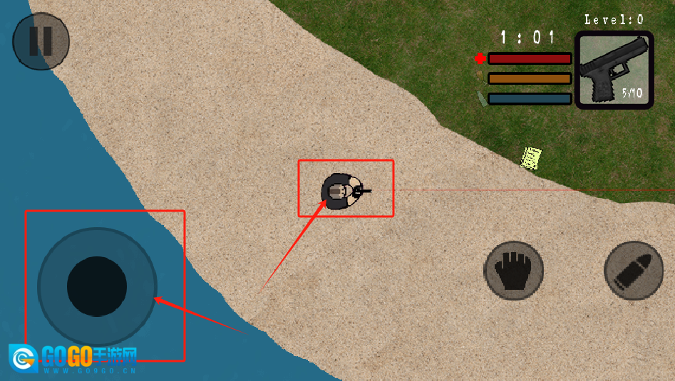 2、操控左下摇杆来移动角色,留意右上角显示的生命值为5/10,以及当前时间1分01秒。
