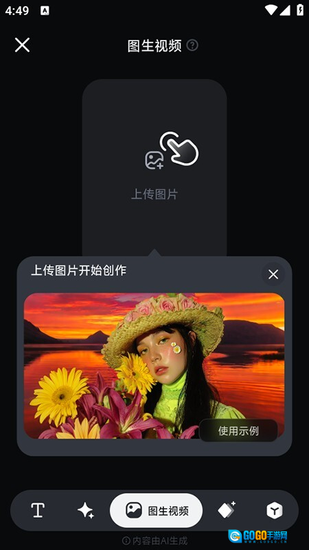 3、图生视频功能操作步骤:上传清晰图片,在提示词输入框中描述所需动作,挑选合适的特效模板,即可生成动态视频。
