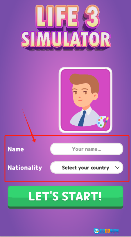1、在紫色界面填写名字与国籍,点击绿色的LETS START按钮即可开启游戏。