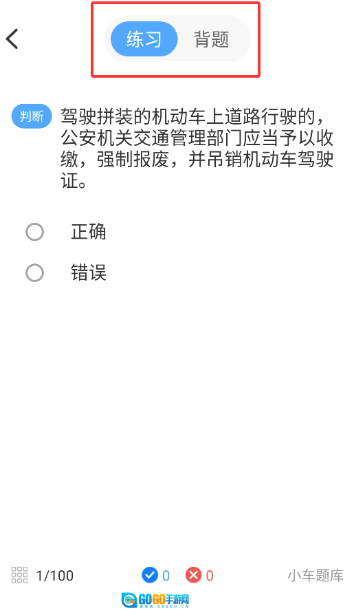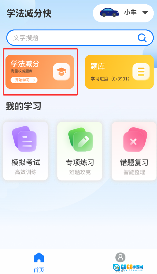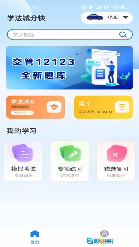 1、启动后,在“学法减分”专区选择学习模式(练习/背题),系统根据交规题库智能出题。