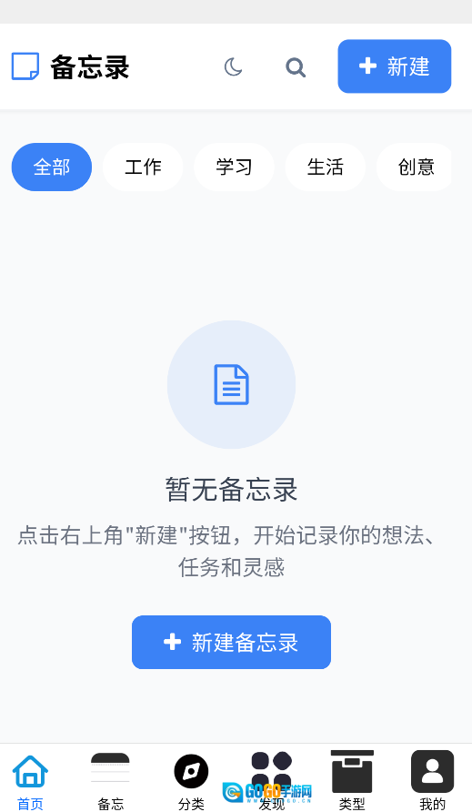 1、启动应用后,点击首页的“新建备忘”按钮,接着选择备忘类型(可在工作、学习、生活中挑选),该功能支持通过语音转文字的方式实现快速录入。