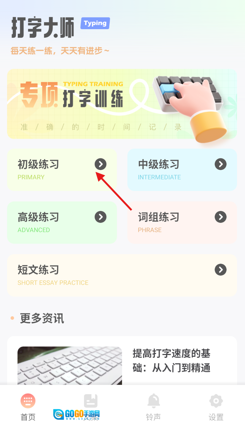 1、启动打字通软件后,在软件的首页界面,能看到初级、中级、高级、词组、短文等不同类型的练习模块。