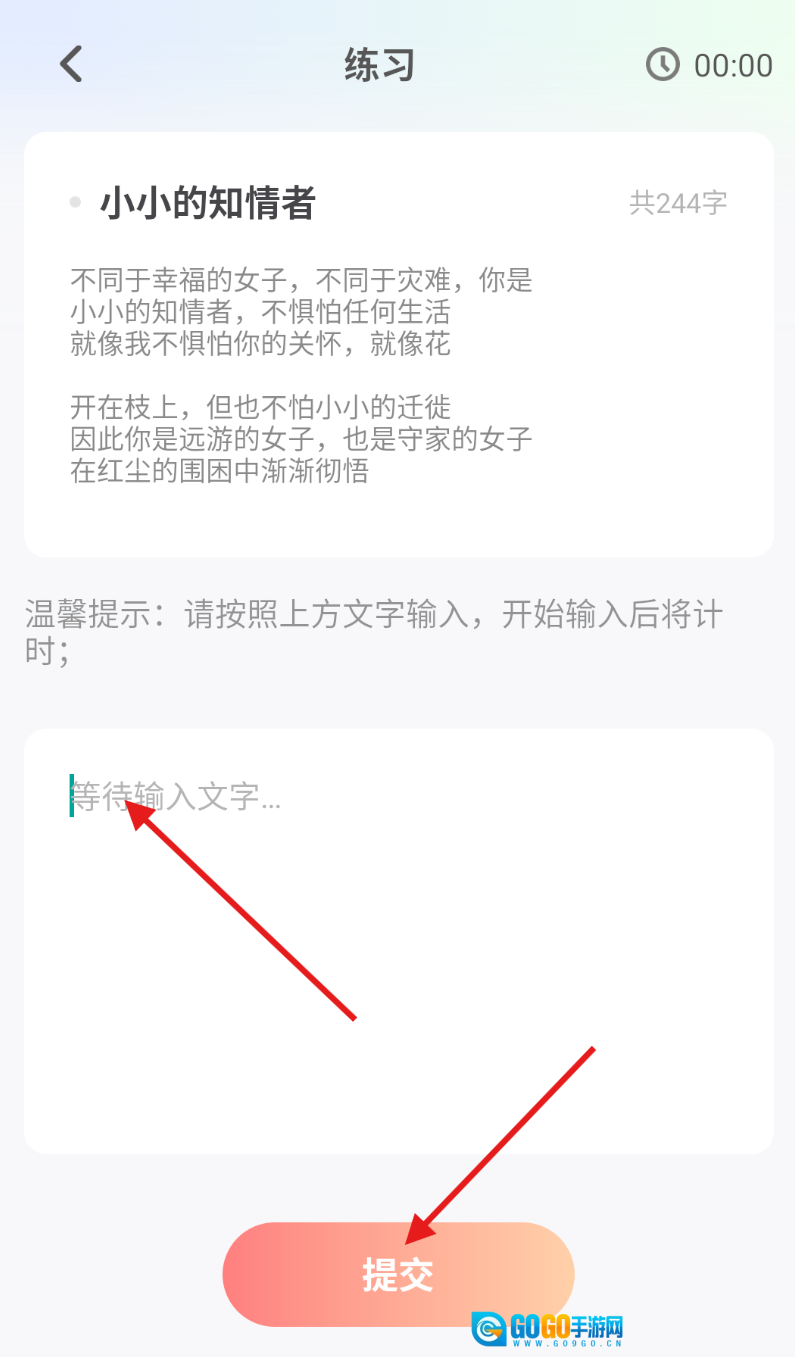 4、进入练习界面后,在待输入文字框中填写相应文字,全部内容填写完毕后点击提交按钮。