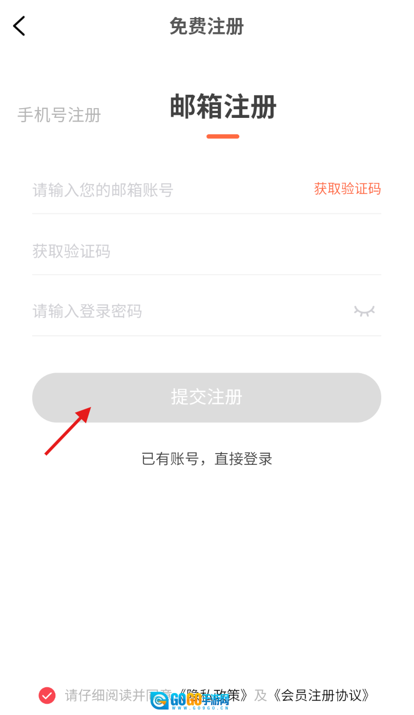 5、输入邮箱账号并设置密码后,点击“提交”按钮,即可完成注册操作。