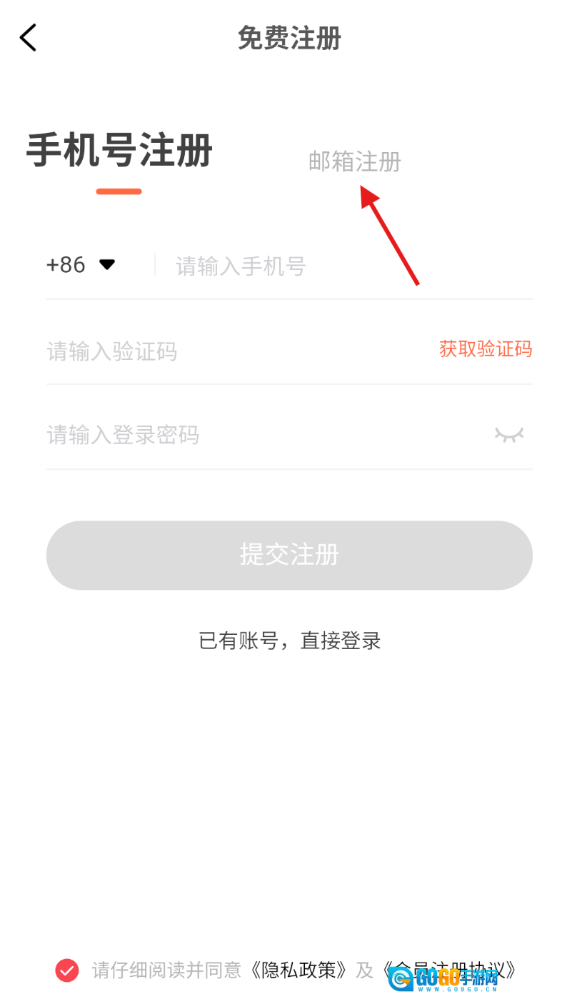 4、在注册页面找到手机号注册与邮箱注册的选项,点击并选择“邮箱注册”。