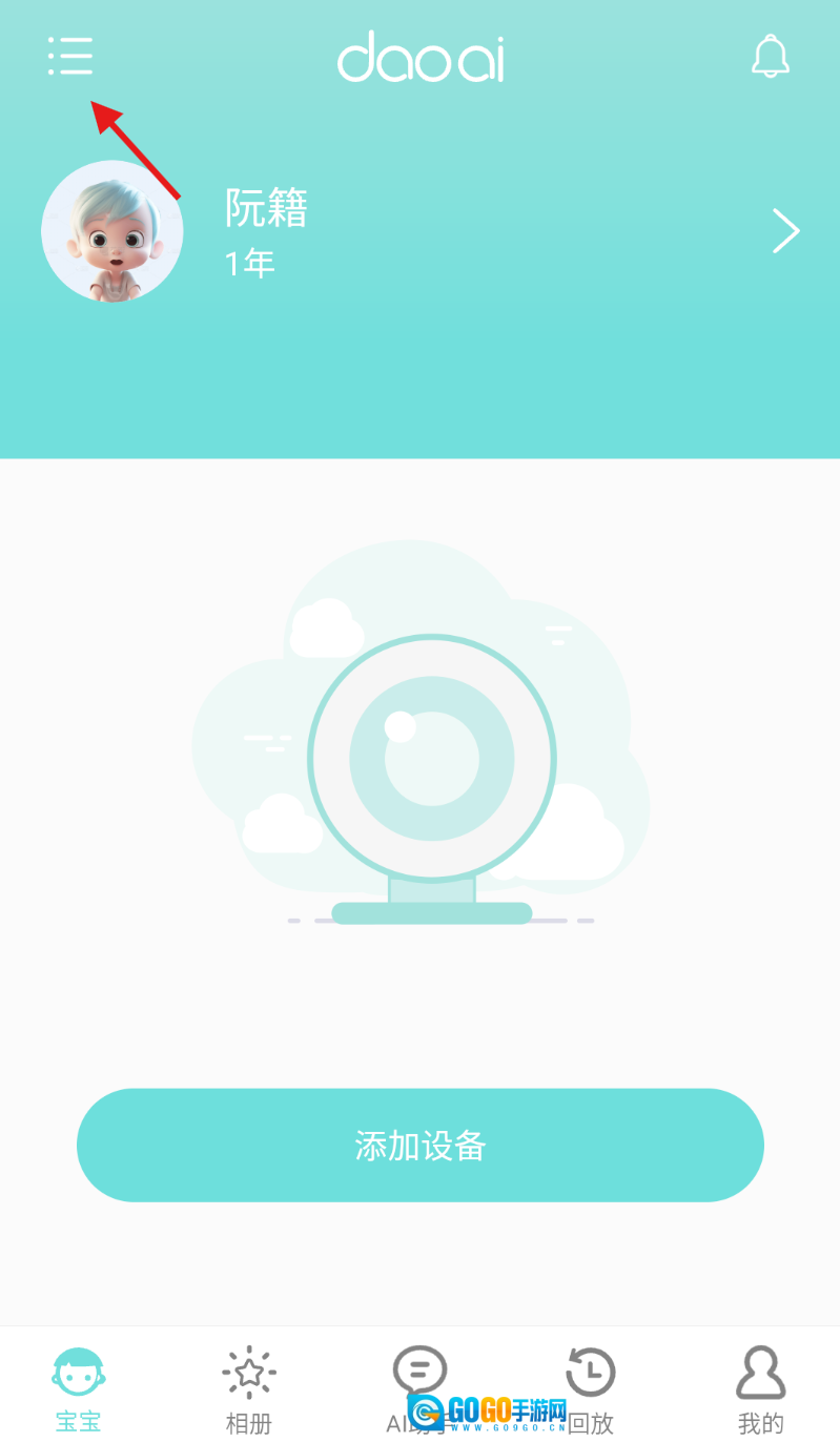 1、启动道爱家庭软件,进入宝宝管理页面后,点击左上角的扩展图标。