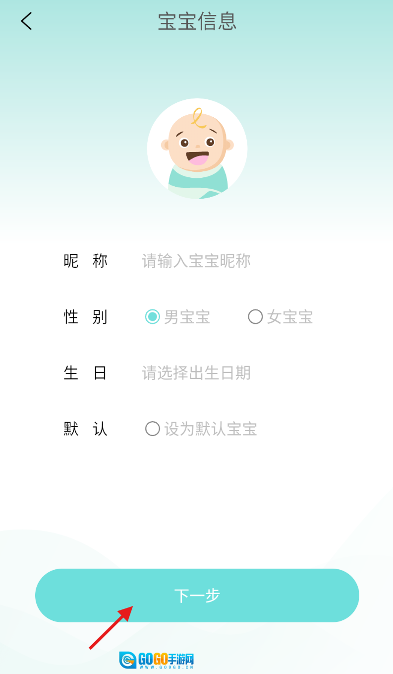 3、请按顺序填写宝宝的昵称、性别、出生日期等相关信息,填好后点击“下一步”按钮,即可完成创建流程。