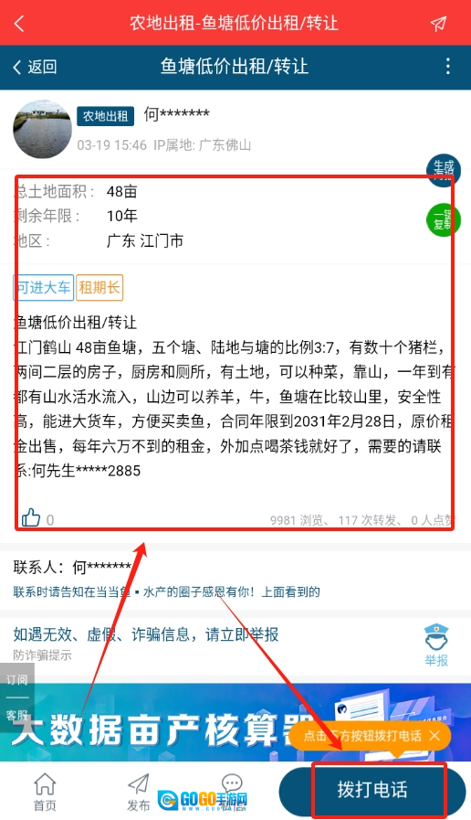 3、若有意租赁该农地,可直接点击右下角的电话按钮与对方取得联系。