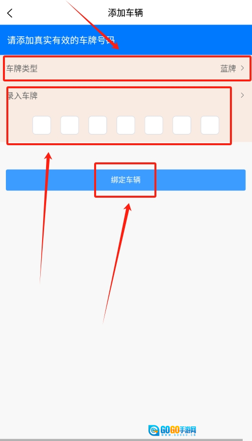 3、首先挑选车牌类型,接着录入车牌号,最后点击“绑定车辆”按钮,即可完成整个操作流程。
