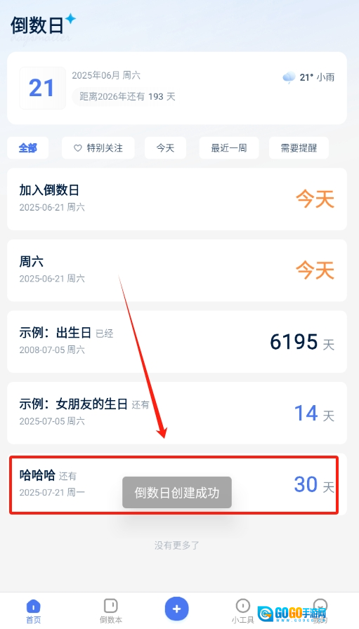 3、保存成功后返回首页,刚添加的倒数日清晰可见,随时都能查看剩余天数。
