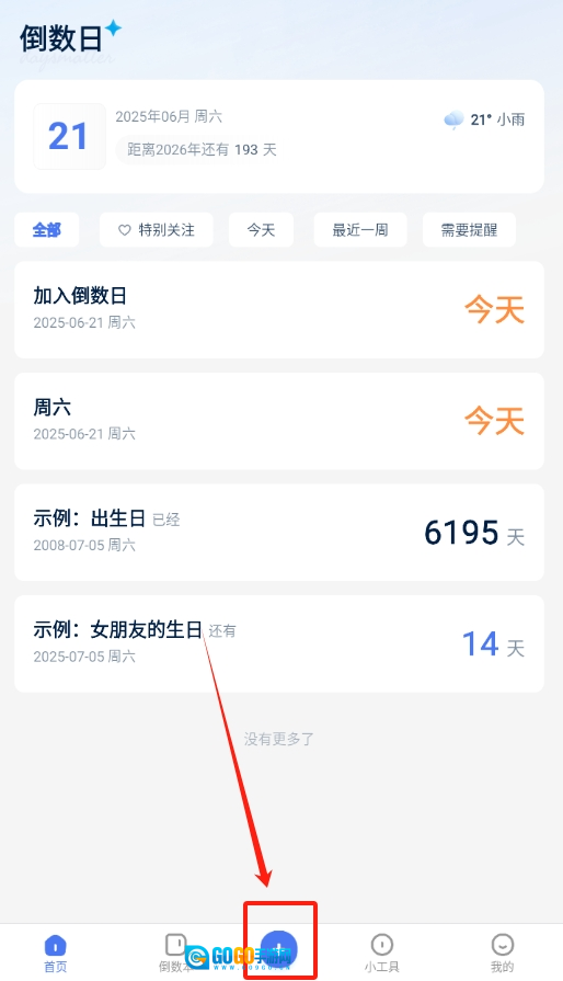 1、打开易知倒数日历,底部的加号按钮很显眼,点击它就能添加倒数日。