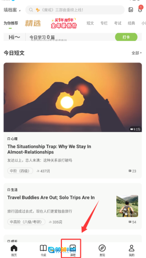 1、第一次使用时需要完成英语水平测试,系统会依据测试结果推荐匹配的阅读难度。你可以通过“发现”页面查看每日的精选文章。