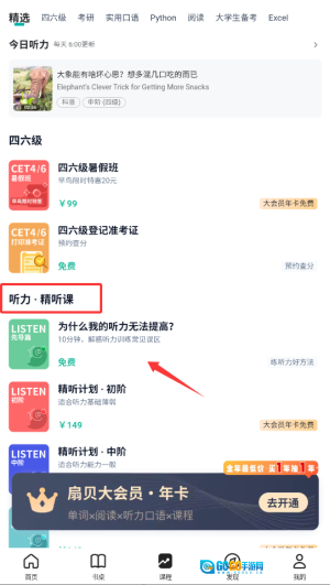 2、进入课程页面后,选择听力板块,找到标注为精听课的系列内容,点击进入详细课程列表。