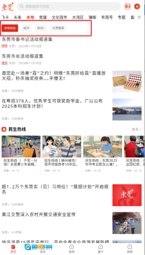 1、打开i东莞后,在首页的导航栏中点击“本地”频道,该频道整合了东莞最新的新闻与生活资讯。