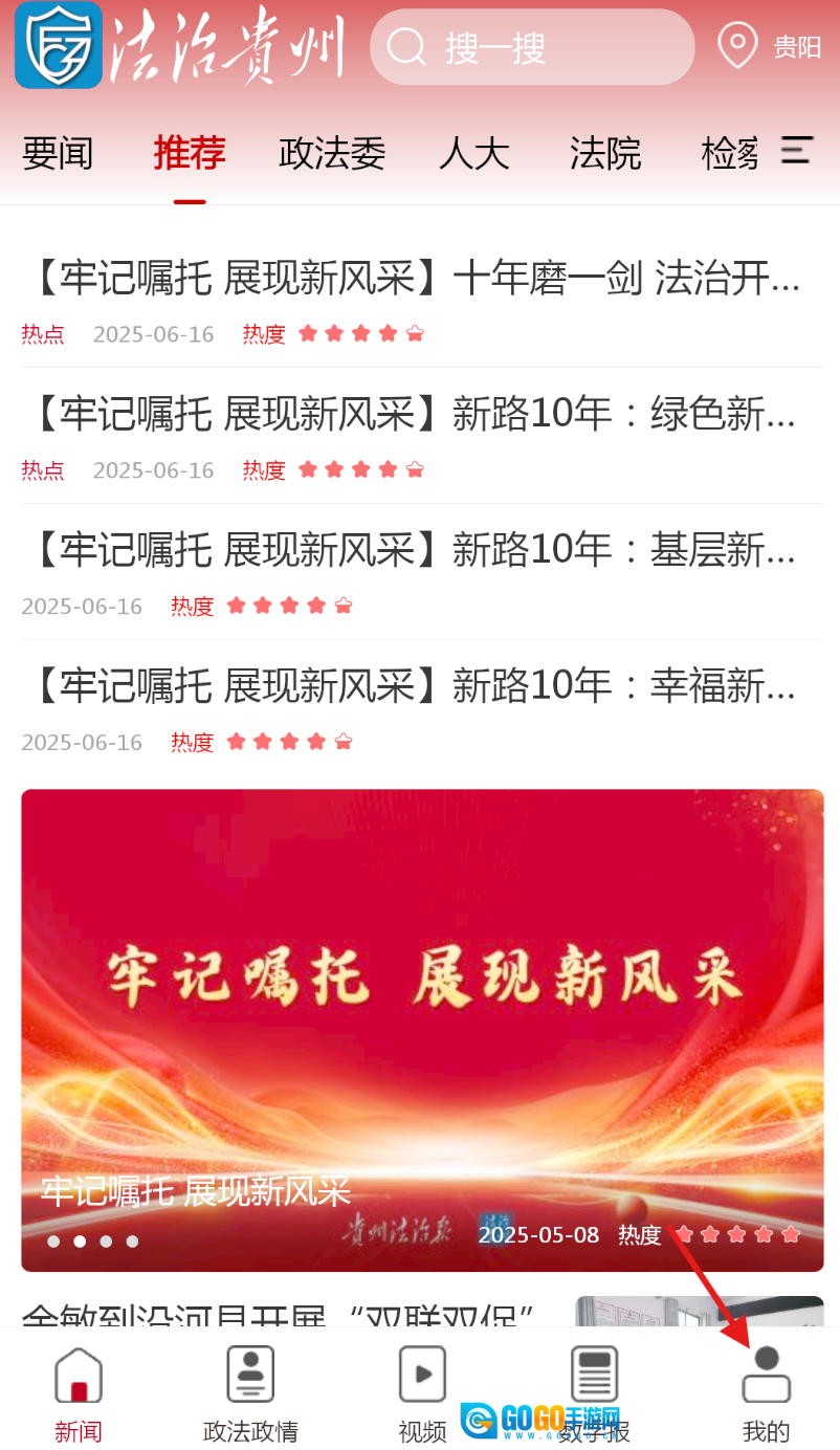 1 、开启法治贵州软件,在界面下方导航栏找到并点击 “我的” 选项,进入个人相关页面。