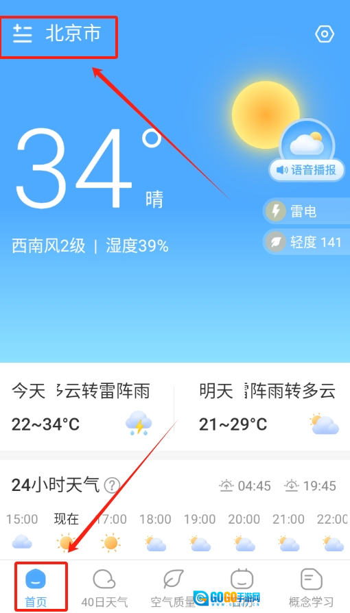 2、打开软件进入主页面:安装完成后,点击软件图标将其打开,进入首页后即可查看默认定位城市的天气状况。