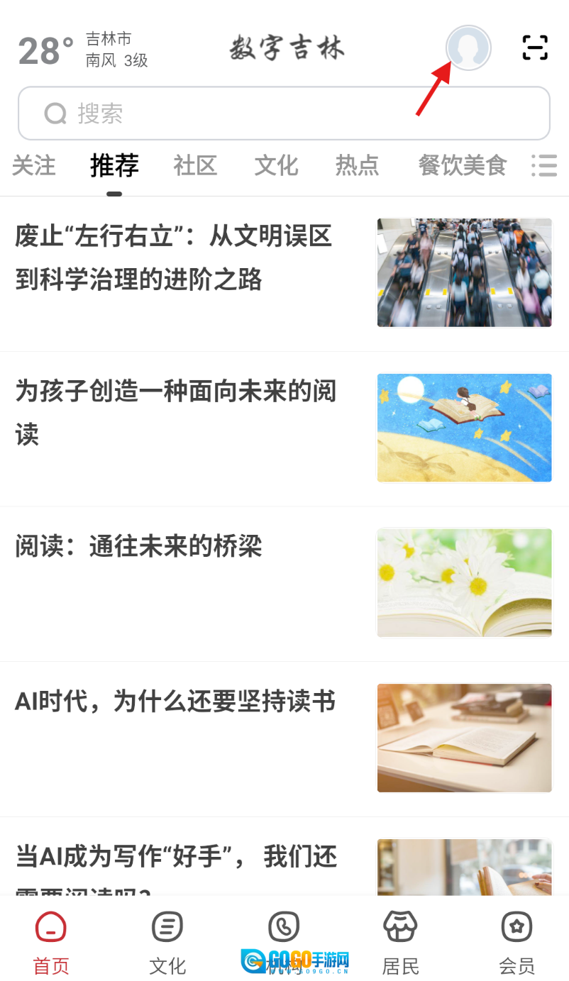 1、启动数字吉林软件,于首页右上角找到头像标识并点击进入相关界面。