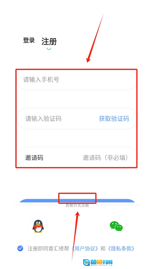 3、若没有账号,在注册页面输入手机号和验证码,按提示完成账号注册。