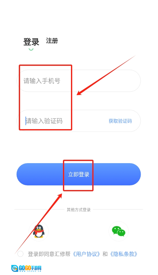 2、进入登录页面,在对应位置输入手机号和收到的验证码,完成账号登录。