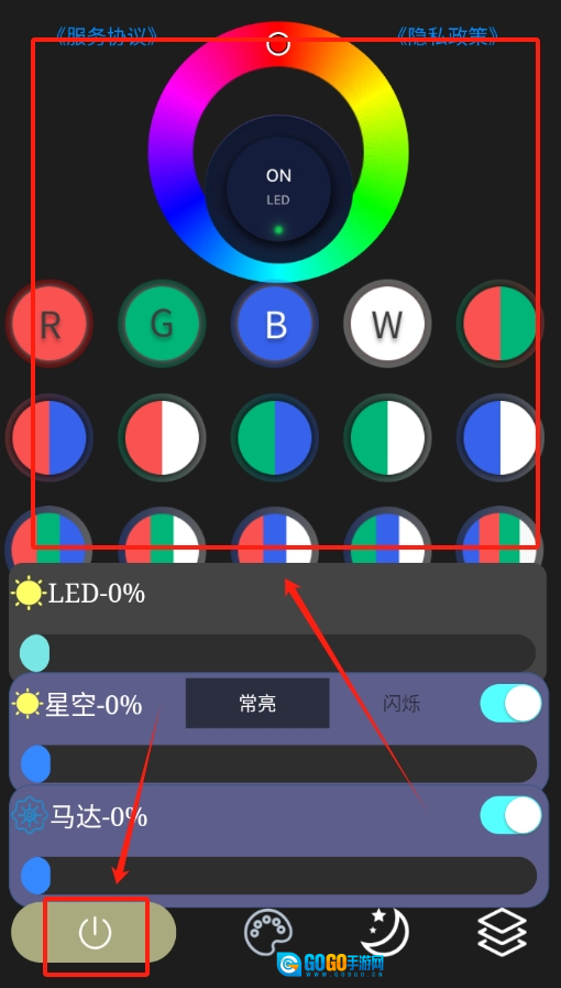 1、开启fashionlight氛围灯后,在主界面找到“调色板”图标,点击进入即可自由选择心仪的灯光颜色。