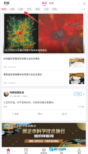 1、进入科技工作者之家后,在首页导航栏选择"科普"频道,这里汇集各类科学知识普及内容。