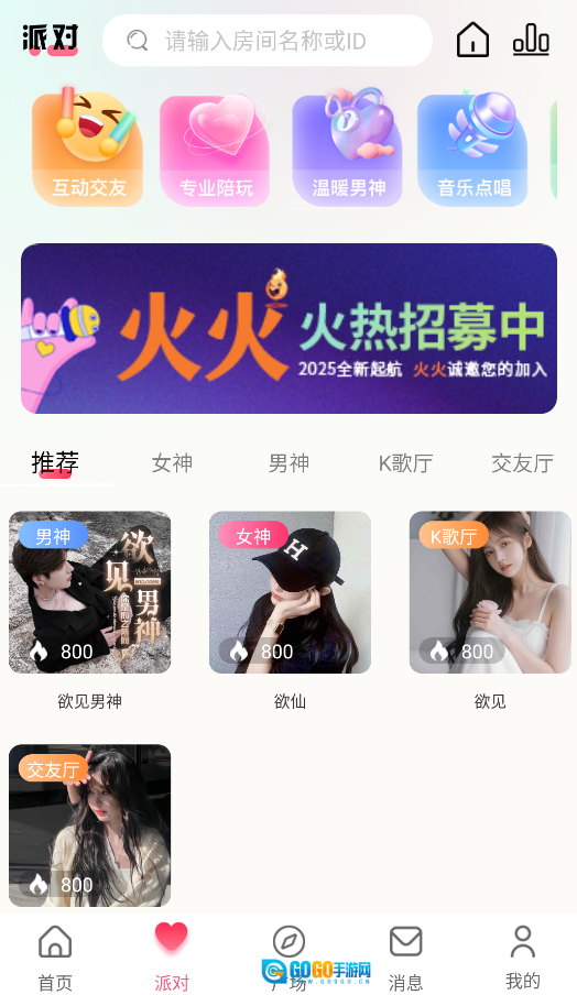 3、进入"派对"选择娱乐模式,包括游戏开黑、K歌房等多样化社交场景。