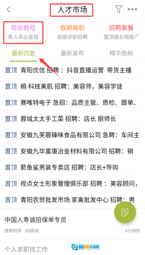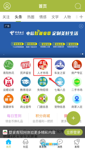1、打开青阳网后,在首页的导航栏里找到“人才市场”频道并点击进入,该频道集中了各类企业最新发布的招聘信息。