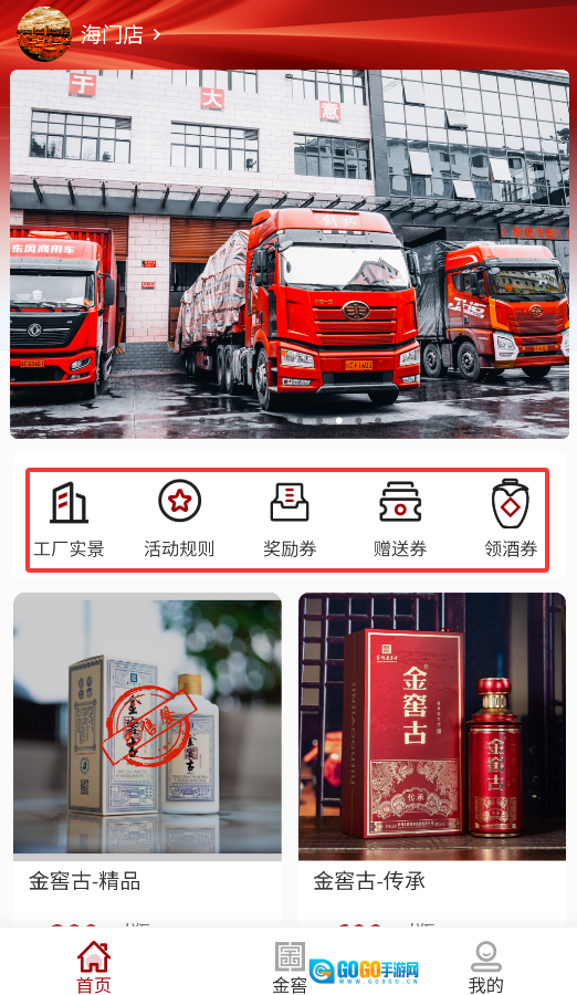 1、启动后,首页展示酒厂实景VR、促销活动及各类优惠券领取入口。