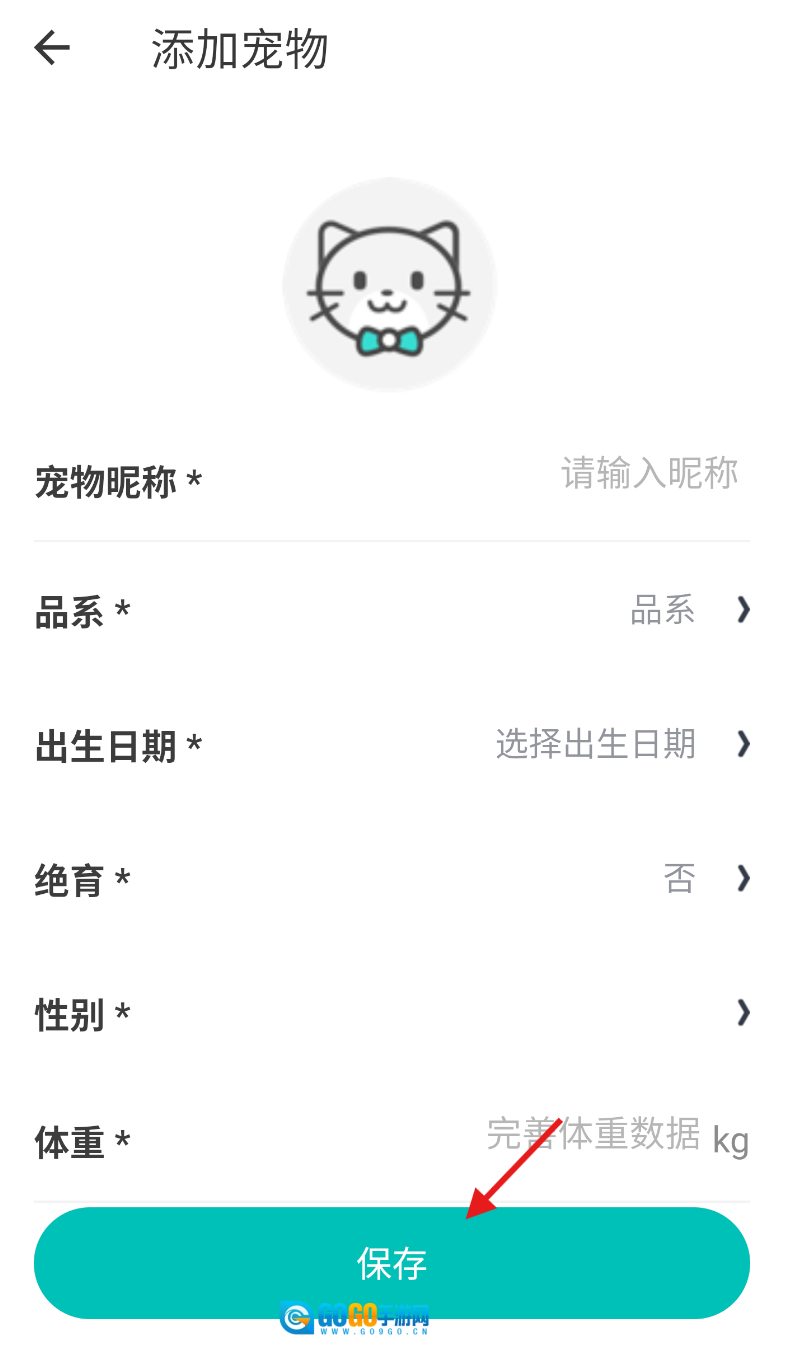 3、进入宠物信息录入界面,填写宠物品种、年龄等详细资料,确认后点击保存完成添加。