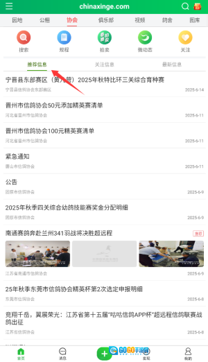 1、进入中国信鸽信息网后,在首页导航栏选择"协会"栏目,这里发布各地信鸽协会最新通知。