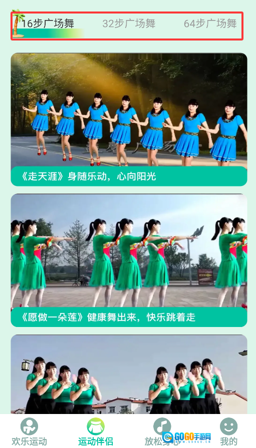 3、“运动教学”板块涵盖了16步、32步、64步等不同难度级别的广场舞分解教学视频。