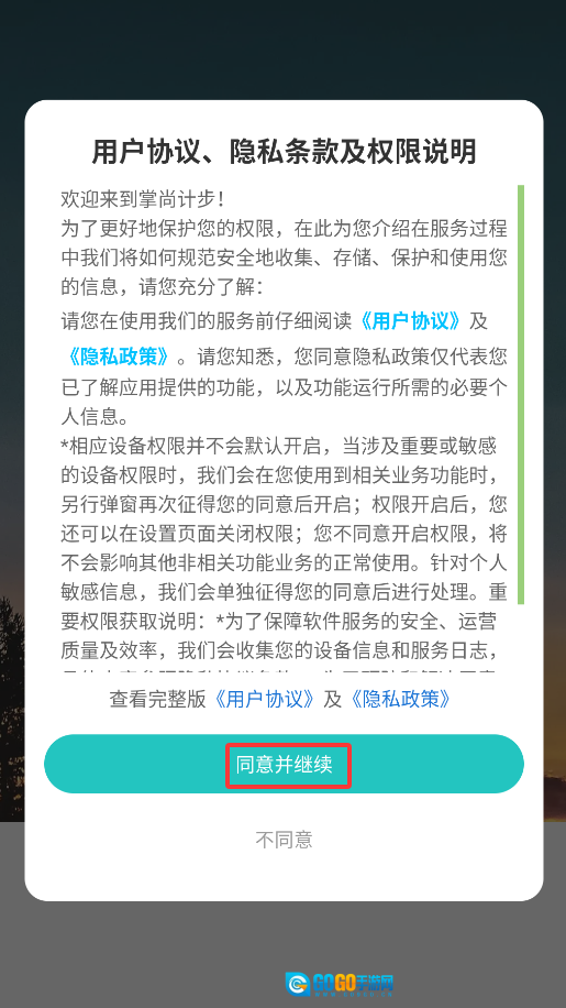 首次启动应用时会弹出用户协议提示,点击“同意”按钮后就能进入运动健康平台的主界面了。