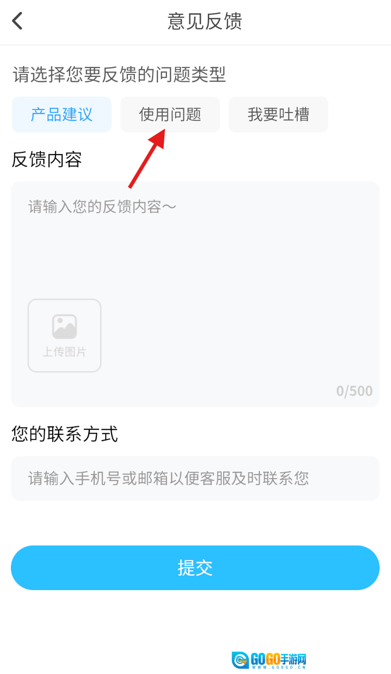 3、在意见反馈界面,从反馈类型选项中选择 “使用问题” 类别,确定反馈方向。