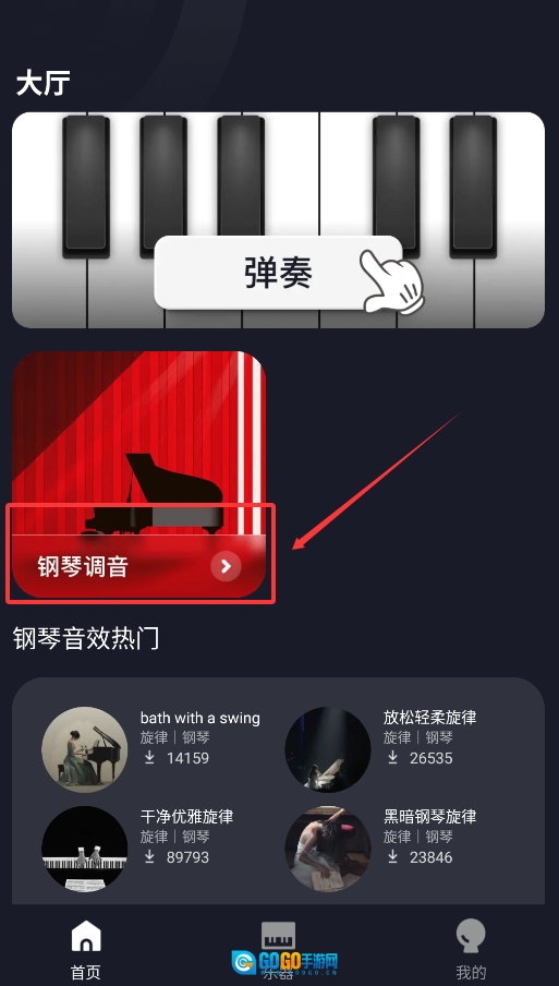 1、打开应用后,在首页选择"钢琴调音"功能,将手机靠近钢琴,应用会自动检测琴弦震动频率。