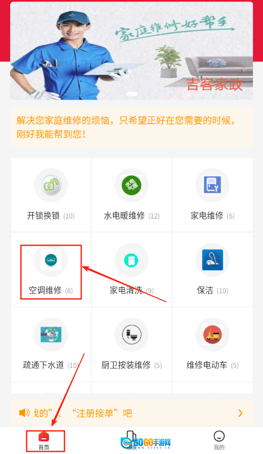 2、返回首页找到家电维修栏目,选择空调维修服务进入商家列表。