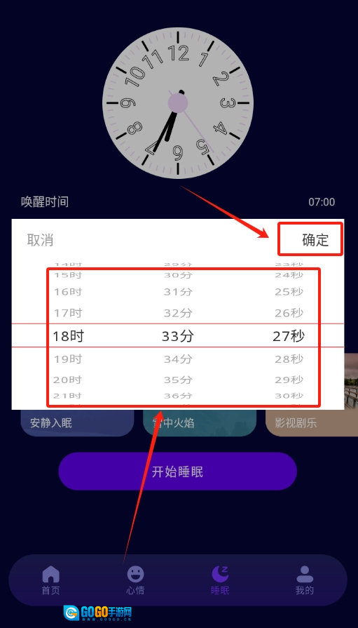 1、打开罐头冥想软件,进入睡眠页面,选好想要起床的时间,点一下确定按钮。