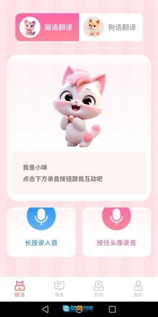 软件首页设有猫语翻译和狗语翻译两个选项,用户可按需选择,之后按住录音键即可完成翻译操作。
