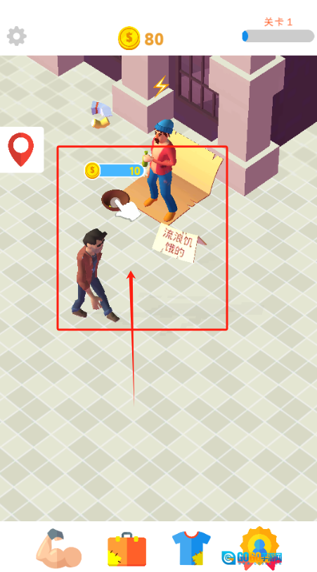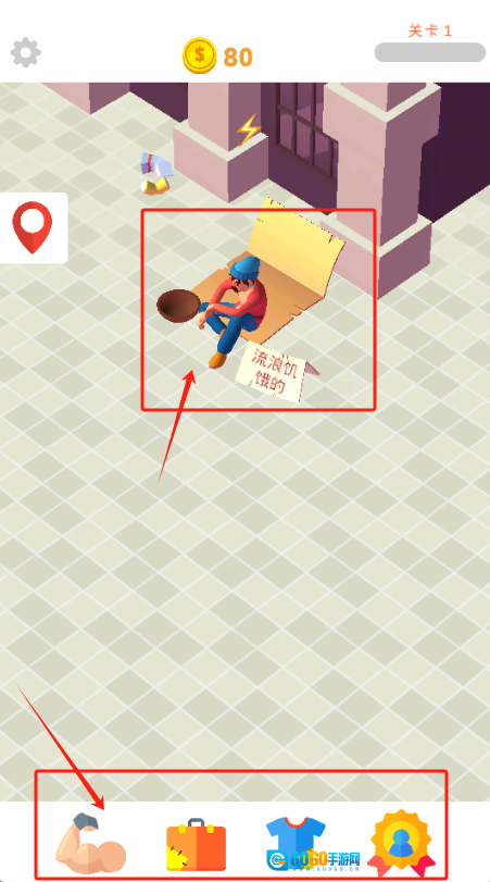 1、点击肌肉图标可以提升乞讨能力,点击衣服图标可以更换装扮,积累到80个金币即可通过本关。