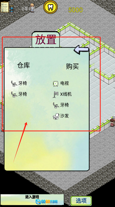 3、把红框内的设备拖到诊室里摆放,目前还剩4600元,得省着点用。