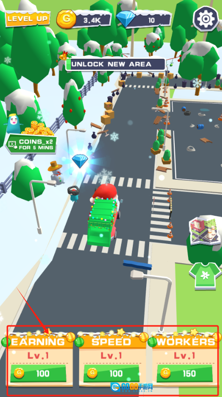 驾驶绿色卡车回收垃圾,提升工人等级与作业速度可获取更多金币,积累足够金币后就能解锁新的地图。