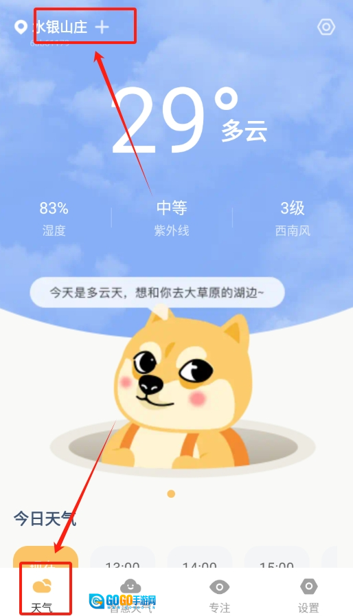 2、打开软件首页后,能通过可爱的小柴形象直观了解当前天气状况,点击该形象即可进入详情页,查看更全面的24小时天气预报信息。